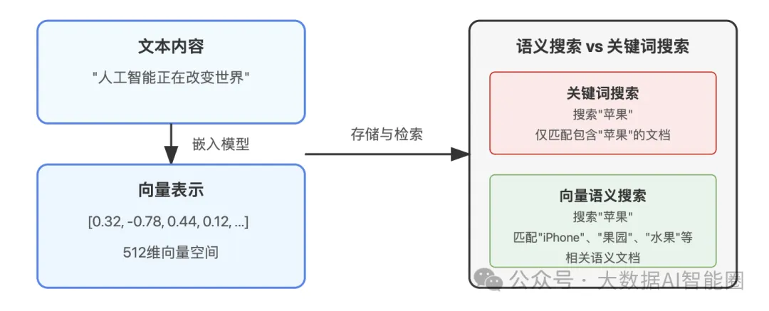 传统关键词搜索仅匹配完全相同词汇,而向量搜索能理解"苹果"与"iPhone"、"猫"与"宠物"间的关联,实现真正的语义理解。