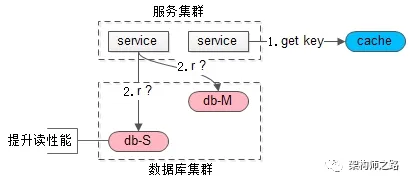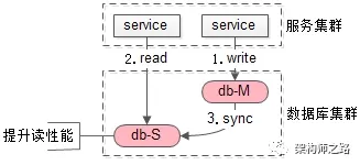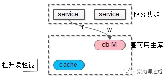 使用一个高可用主库提供数据库服务;读和写都落到主库上;采用缓存来提升系统读性能;这是很常见的微服务架构,可以避免数据库主从一致性问题。