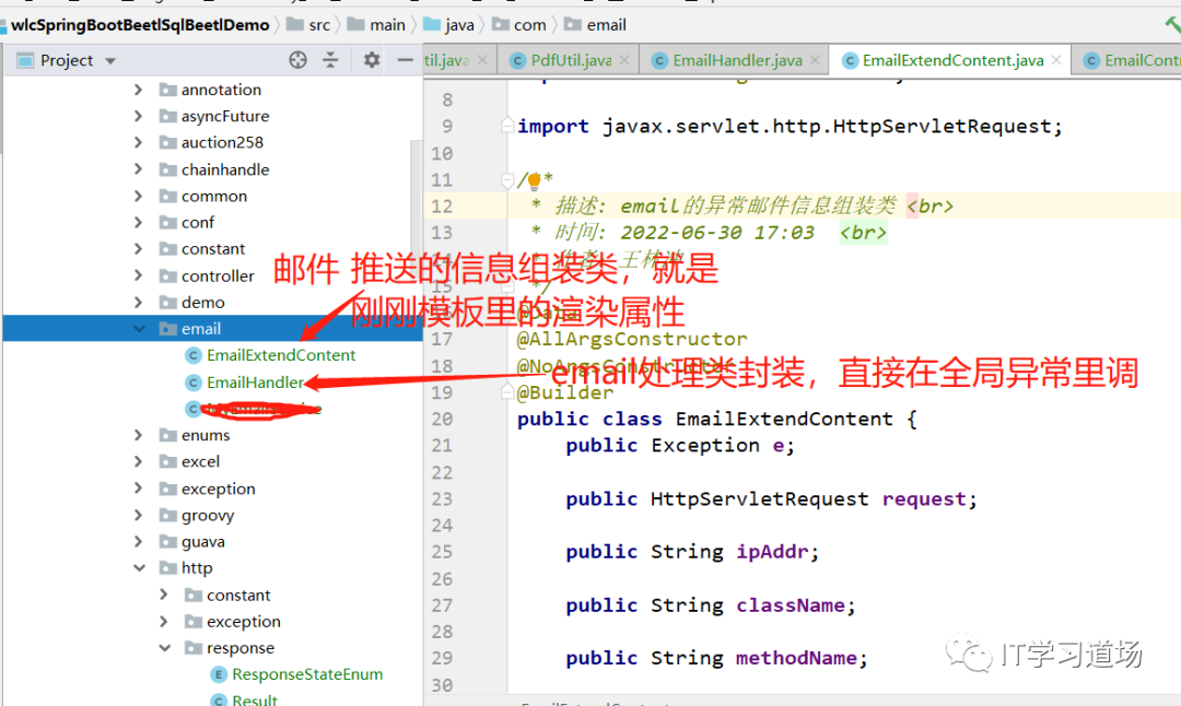 /** * 描述: email处理类 <br> * 时间: 2022-07-01 11:11 <br> * 作者:IT学习道场 */@Componentpublic class EmailHandler{