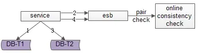要插入两次,请求的处理时间增加;数据仍可能不一致,写入T1完成后服务重启,则数据不会写入T2;如果系统对处理时间比较敏感,引出常用的第二种方案。