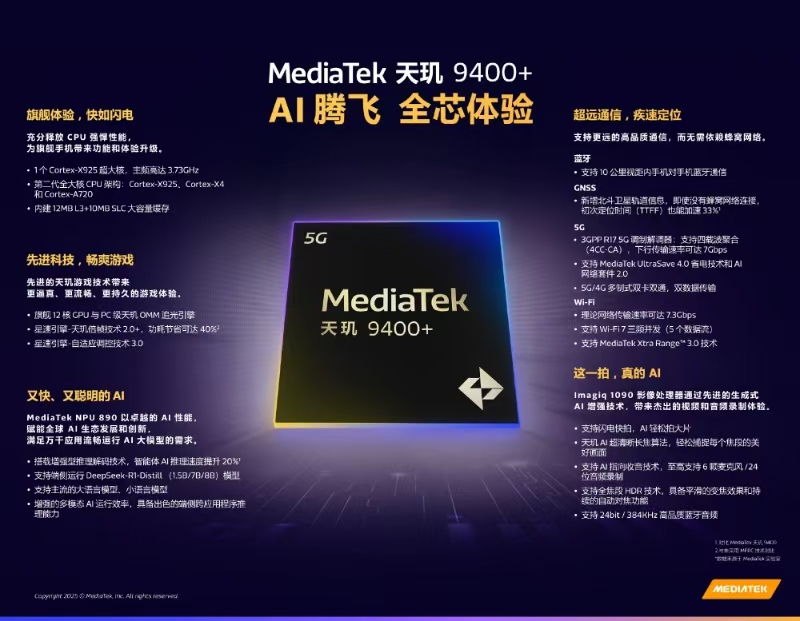 天玑 9400+采用第二代全大核架构,8核CPU包含1个主频高达3.73GHz的Arm Cortex-X925超大核,以及3个Cortex-X4超大核和4个Cortex-A720大核。天玑 9400+ 集成 MediaTek 第八代 AI 处理器 NPU 890,端侧率先支持DeepSeek-R1推理模型四大关键技术,同时率先支持增强型推理解码技术(SpD+),智能体AI任务的推理速度可提升20%。MediaTek天玑9400+搭载12 核 Arm GPU Immortalis-G925,支持天玑OMM追光引擎和天玑倍帧技术,不仅带给用户惊艳的视觉效果,还能提供持久流畅的移动游戏体验。