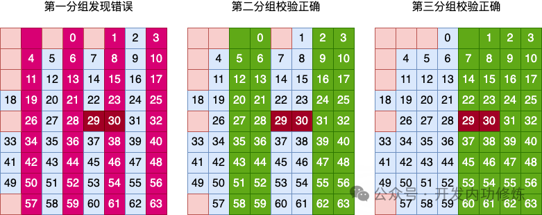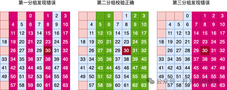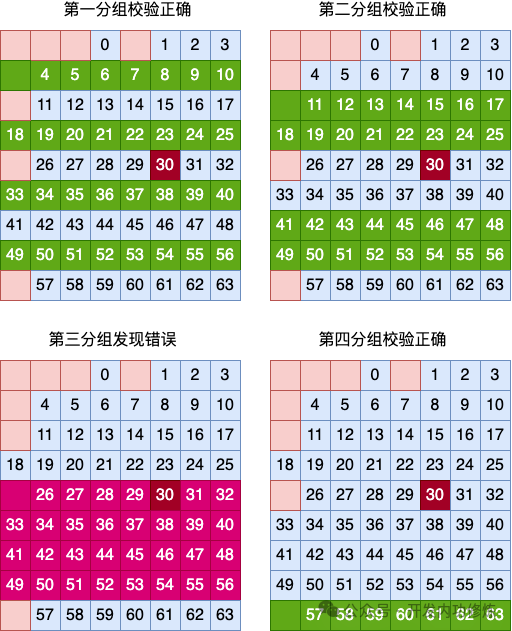 第一行分组校验通过、第二行分组校验通过、第三行分组校验失败、第四行分组校验通过。那么根据行分组的交叉关系,就可以推断出出错数据发生在第 5 行。