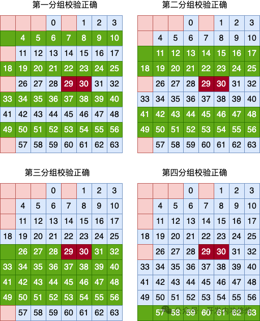 我们假设用户数据的第 29、第 30 比特位发生了错误。那么由于是同时发生了两个错误,那么整个矩阵中的校验肯定是无法发现的,校验通过。
