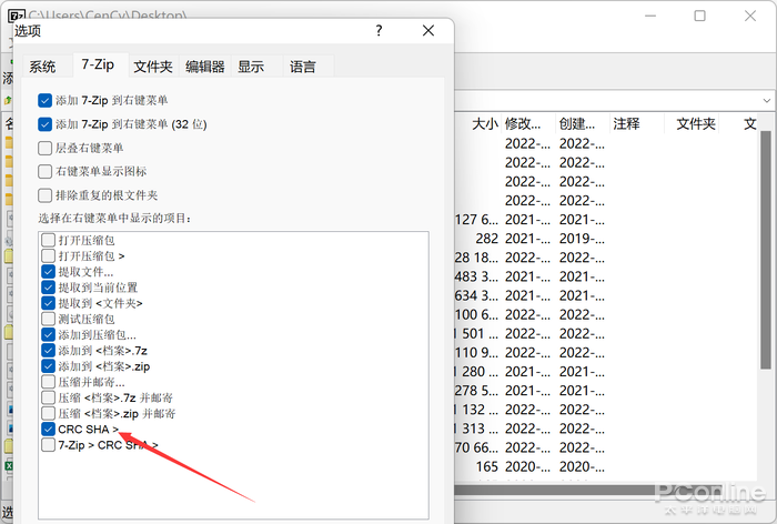 打开7-Zip的主界面,点击“工具”进入“选项”,即可看到多个选项卡。切换到“7-Zip”,勾选“添加7-Zip到右键菜单”,并勾选下面“CRC SHA”的选项,之后用右键点击文件,就可以看到7-Zip提供的Hash功能了。