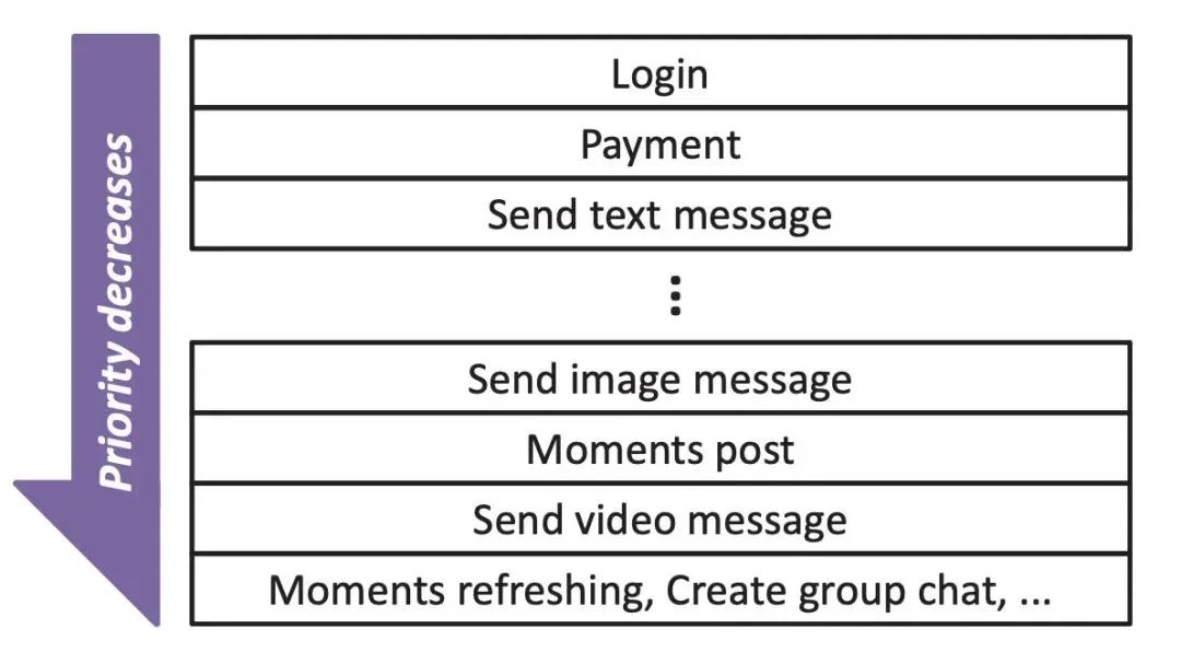 1、业务优先级对于不同的业务场景优先级是不同的, 比如登录场景是最重要的业务,不能登录一切都白瞎,另外支付消息比普通消息优先级高,因为用户对金钱是更敏感的,但普通消息又比朋友圈消息优先级高,所以在微信内是天然存在业务优先级的。