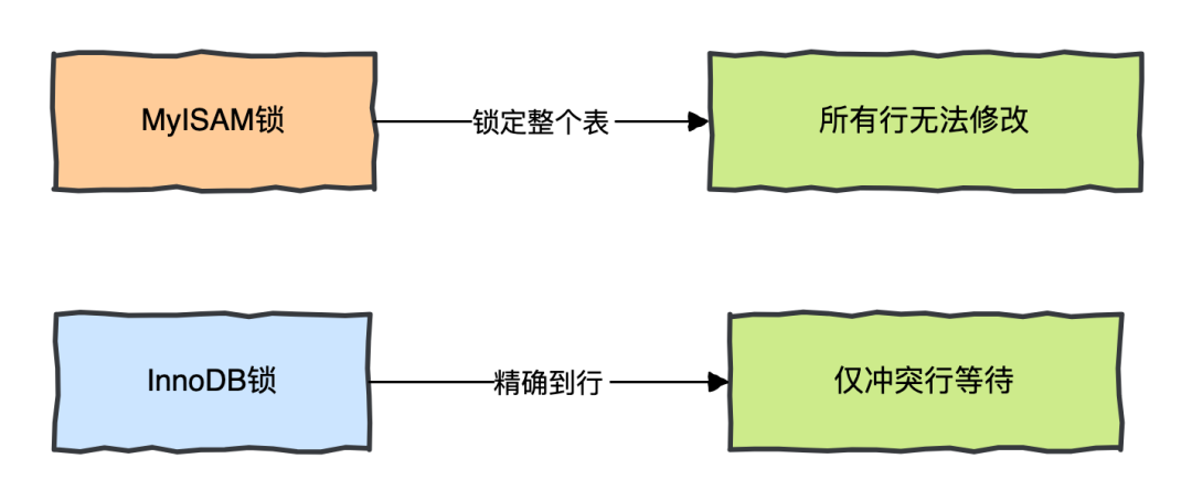 UPDATE stock SET count=count-1 WHERE sku_id=101; # MyISAM下会阻塞,InnoDB正常执行1.2.3.4.5.6.