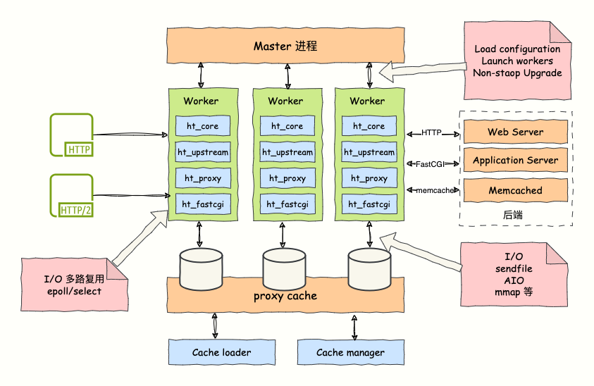 主进程并不处理网络请求,而是负责调度工作进程,包括加载配置、启动工作进程以及进行非停升级。
