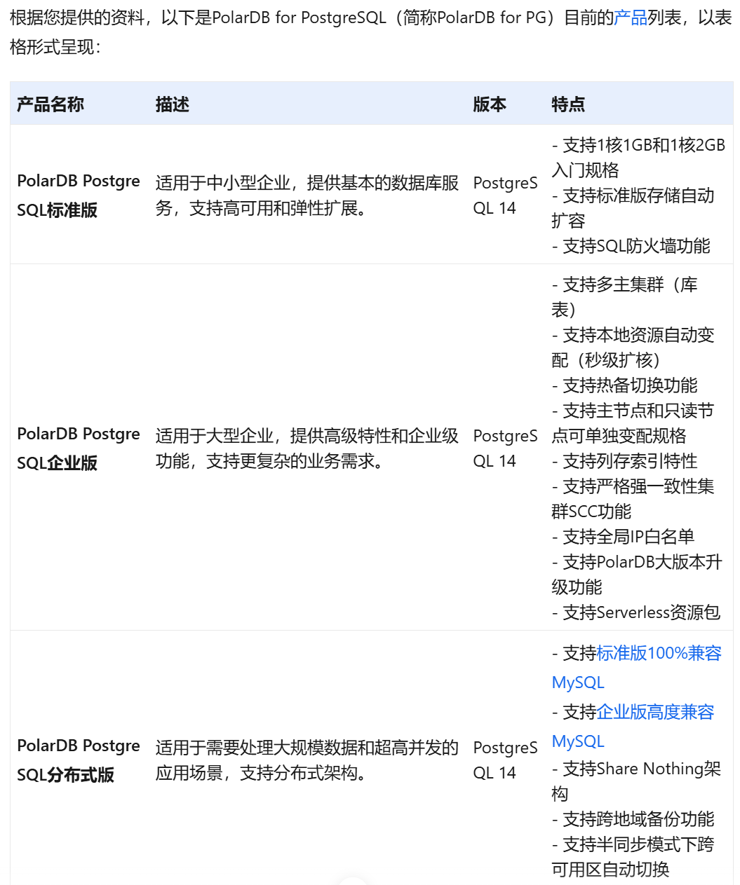 Q:PolarDB for PG 目前有哪些产品,用表格方式输出