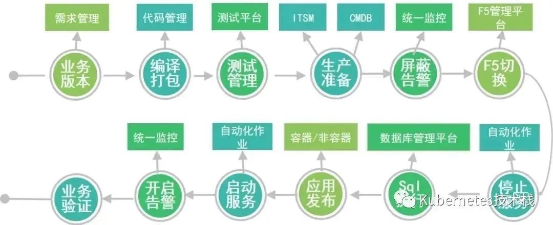 通过自动化发布工具,我们可以构建流水线实现部署的过程中所有的操作(如编译打包、测试发布、生产准备、告警屏蔽、服务停止、数据库执行、应用部署、服务重启等)全部自动化。