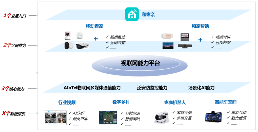 中国移动智慧家庭运营中心经多年技术积累,基于AIoTel物联网多媒体通信能力、泛安防监控能力、场景化AI能力3大核心能力,攻关视联网关键技术,构建视联网能力平台,孵化移动看家、和家智话2类全网业务,以和家亲APP为智家服务入口,创新探索多类信息服务场景,打造1+2+3+X泛家庭信息服务体系(如图1),支撑泛家庭市场高质量发展。目前基于视联网能力,接入智能终端数达千万级规模,用户规模、云存储规模位居业界第一。