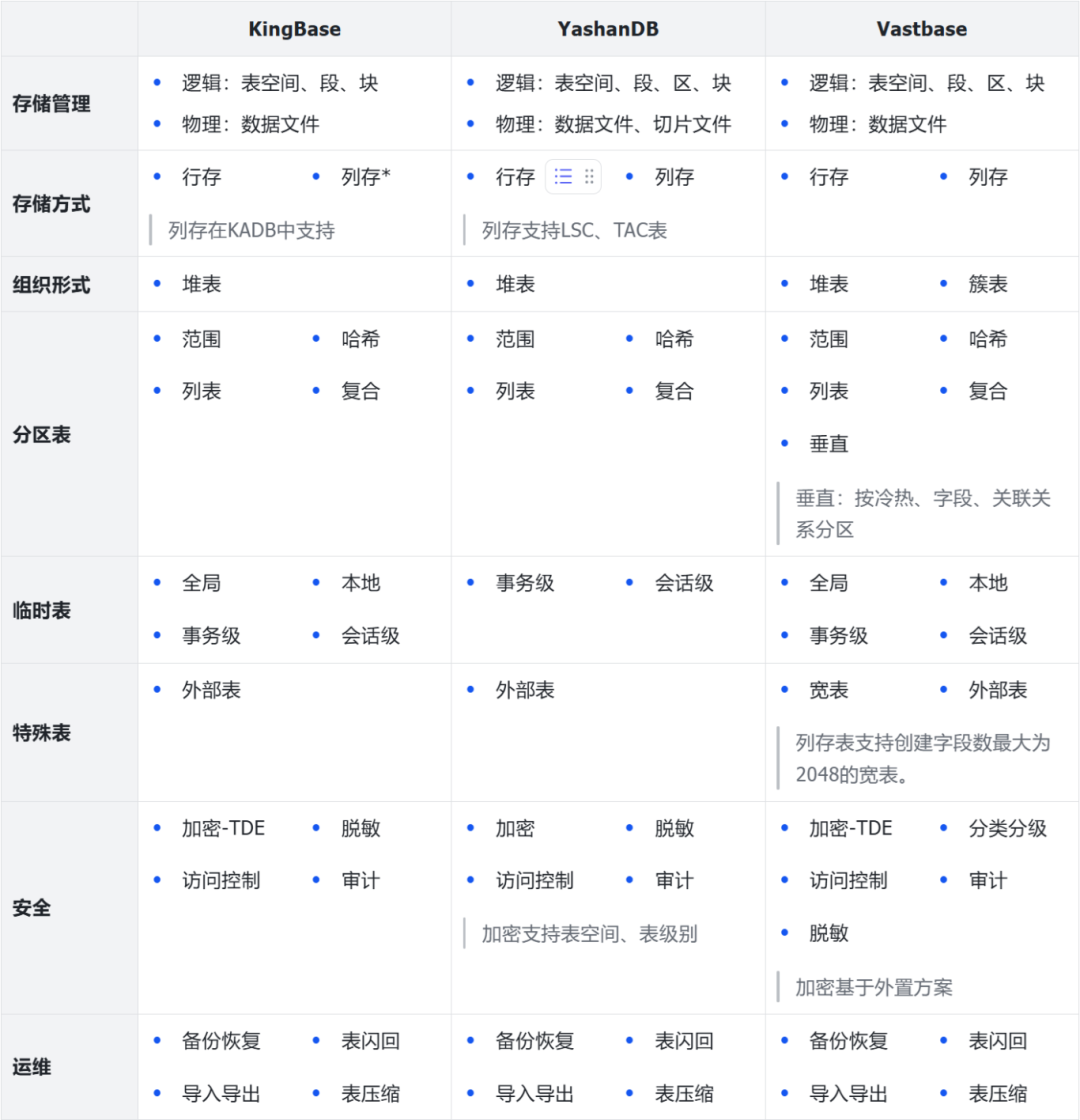 表的运维场景也很多,这里选择场景的备份恢复、导入导出、压缩、闪回等。针对上述能力,各家产品大多已支持,差异在于实现程度各有不同。例如,针对压缩功能,有的产品是可以灵活选择压缩算法,有的产品则当数据填充量达到一定阈值就自动启用压缩等。