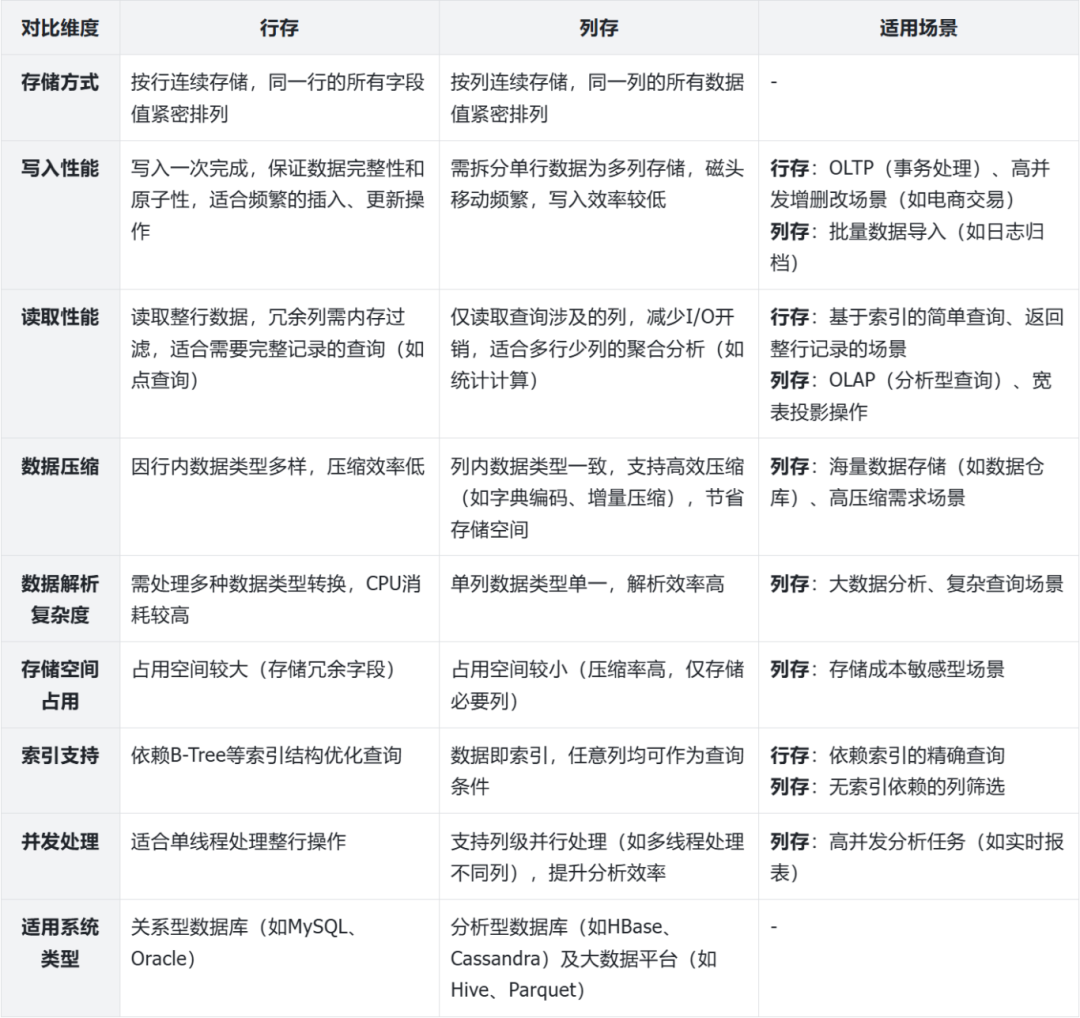 上述数据库均支持了行存方式,为了满足分析类需求,一般也都提供了列存选择;但在产品设计上还是采取独立方式,对用户来说存在一个成本;甚至有的厂商就是在不同产品层面实现,用户使用成本更高些。此外,部分厂商为应对列存先天带来的不足,也采用了“混合”设计的方式,提供多种选择。Oracle 的方式相对优雅,通过内存的方式,由系统自动完成维护的方式;类似也有分布式数据库产品提供行、列式存储副本的方式来解决。