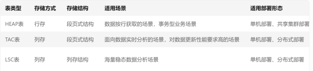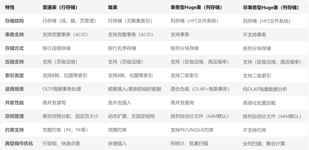 下面以达梦数据库为例,默认提供的普通表是簇表结构,同时也提供了堆表的选择。此外,针对分析需求则提供了Huge表。Huge File System(简称 HFS)是达梦数据库实现的,针对海量数据进行分析的一种高效、简单的列存储机制。列存储表(也称为 HUGE 表)就是建立在 HFS 存储机制上的一种表。