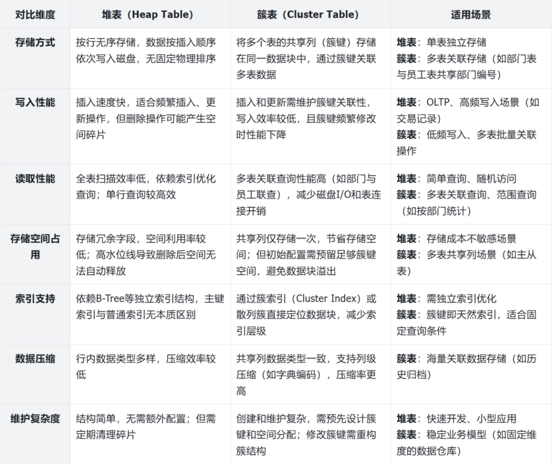 在组织形式上,各家产品的策略不同,一般都提供了对堆表、簇表的支持,但不同在于默认形式不同。也有的数据库产品提供了其他的组织形式。下图简单对比下堆表与簇表的差异