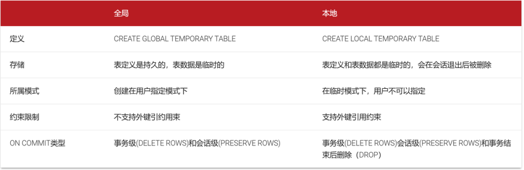 5)临时表各家产品对临时表,也都支持。以金仓数据库为例,临时表用于存放只存在于事务或会话期间的数据。临时表中的数据对会话是私有的,每个会话只能看到和修改自己的数据。您可以创建全局(GLOBAL)临时表或本地(LOCAL)临时表。 临时表对于必须临时缓存结果集的应用程序很有用。创建临时表使用CREATE TEMPORARY/TEMP TABLE语句。将 GLOBAL 或 LOCAL 写在 TEMPORARY 或 TEMP 的前面,指定全局临时表或本地临时表。创建临时表时若不指定GLOBAL或LOCAL,则默认值为LOCAL。
