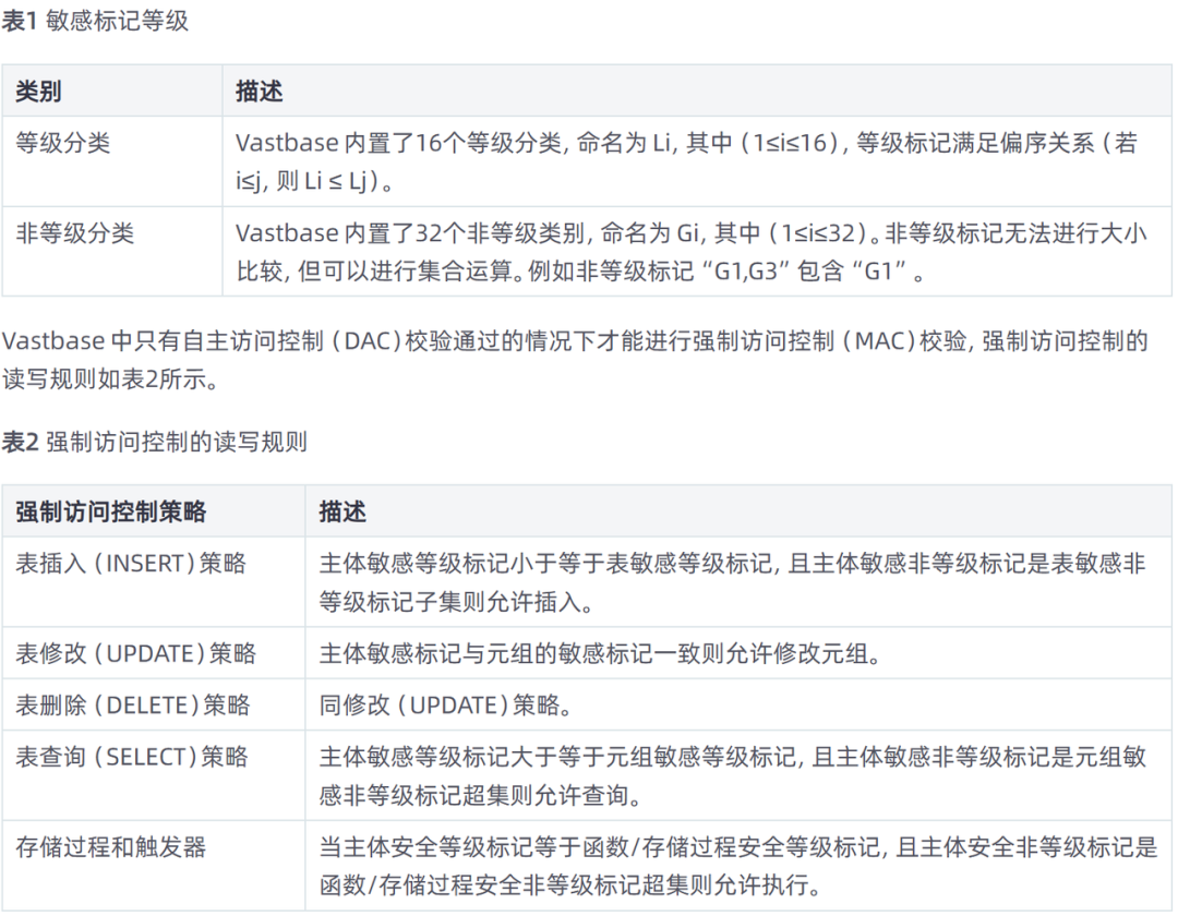 7)安全安全能力覆盖范围很广泛,这里抽取了与表有相关性的加密、脱敏、审计、防火墙、访问控制等几个来对比。以加密为例,各家产品的实现差异是比较大的。有的产品支持了灵活的加密粒度(库、表、列)、多种加密算法(AES、国密等)、甚至多级密钥管理都是支持的;有些产品则较为简单,提供加密包用户自行实现。但针对加密功能,从文档上看普遍缺少对实用性的描述,例如如何做密钥轮转、加密后性能衰减如何等,看来还是有待于进一步增强。除加密外,其他安全能力各家差异更大,如脱敏的支持等等。比较有意思的是海量的 Vastbase,还通过标签能力提供类似分类分级的功能,比较有特色。Vastbase中敏感标记由等级分类和非等级类别两部分组成,针对不同等级分类,可采取不同控制策略。