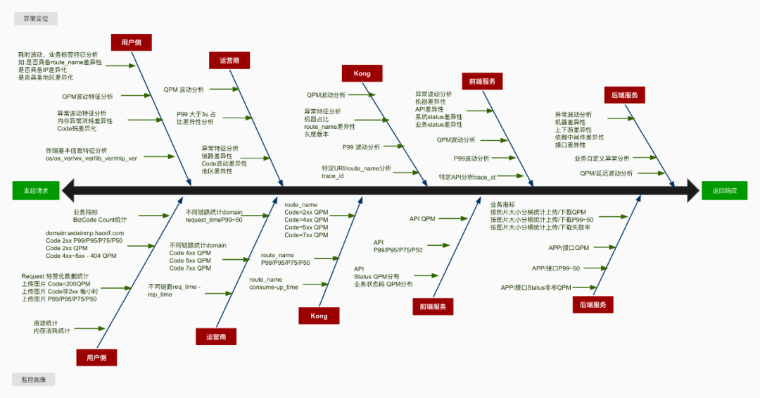 为了尽可能的观测各个环节,我们需要梳理一个脉络,如请求的开始到结束,抓住这两点,连成一线,分两面,一面关注长期趋势,一面关注异常分析。