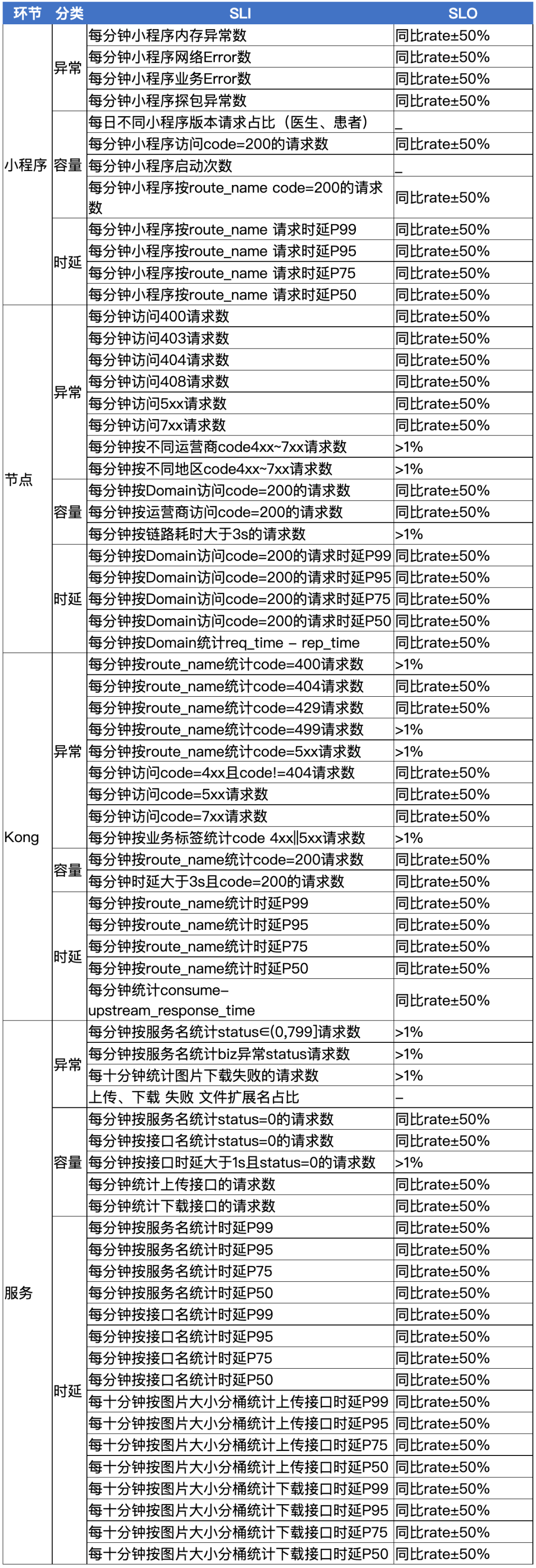 有了这些准备工作,提炼了以下 SLI 和 SLO,大家可以参考一下。