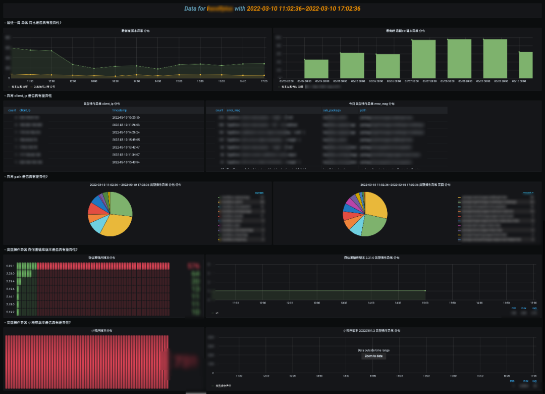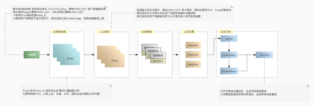 1、用户侧每次小程序启动的时候发起一个探包请求,会上报一下版本信息(平台/版本/微信版本/微信基础库版本/小程序包名/小程序版本),当然为了安全审计不会收集用户隐私相关的信息。探包请求还额外获得了小程序启动频次的粗略统计数据。通过 hash 算法生成版本信息的指纹 hash_key,后续的用户请求 url 和 http header 中都携带这个 hash_key。通过 hash_key 关联 kong 日志和版本信息,从而能提炼出终端不同维度的 SLI。为了将整个链路串联起来,小程序每次请求生成 trace_id,并通过 header 透传下去。小程序网络不佳的时候,会先将 Error 等日志信息暂存到 LocalStorage 队列中,等有网了再次上报。所有记录日志的地方都会记上 trace_id,方便后续异常定位分析。2、网络节点新增运营商标识,方便对比分析不同运营商传输的可用性。收集运营商的日志,存储到 Clickhouse 中,方便后续分析,尽可能让网络传输节点可观测。3、入口网关按业务类型拆分 route_name,如上传,订单提交等等。route_name 支持打标签,如业务部门,所属页面等,方便告警监控及识别到的风险通知到具体的业务部门。插件支持生成 trace_id 或透传已生成的 trace_id,打通 KongLog 和后端服务 TraceLog。4、后端服务增加日志埋点,分析不同图片尺寸大小的上传下载相关的指标。定义好不同的 code 码,方便异常定位分析。5、可观测平台鉴于之前研发了强大的分析器,只用添加分析,告警规则就能满足这次场景需求。为了节约研发成本,SLI 存储到了 Clickhouse,可视化基于 Grafana 写 SQL 绘制。新增地理位置分析,将请求 ip 转换成经纬度,方便提炼地区维度的 SLI。整个小程序日志上报的流程如下: