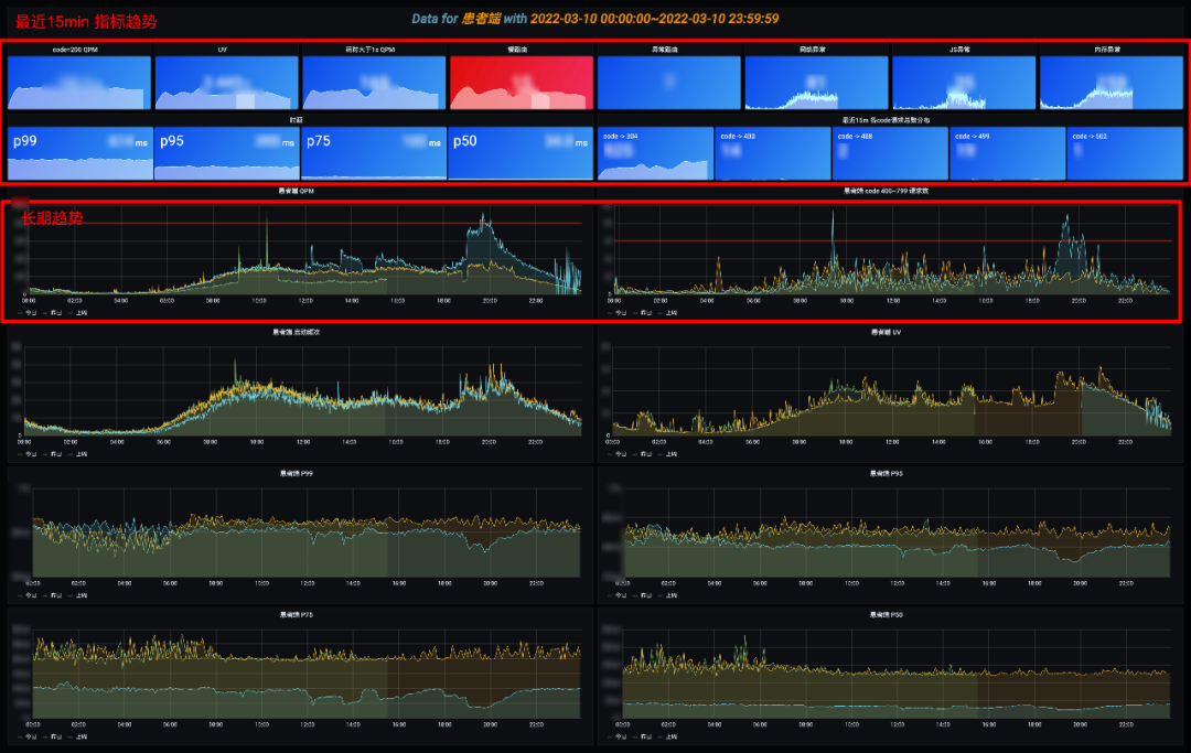 首页一定要清爽,列出最关心的 SLI,如 QPS/UV、慢路由请求数、异常请求数。根据时延和 ErrorCode 分布,下钻到具体的分析页面。也可以通过分析长期趋势,查看小程序整体的状态,如慢路由风险是否在增加。