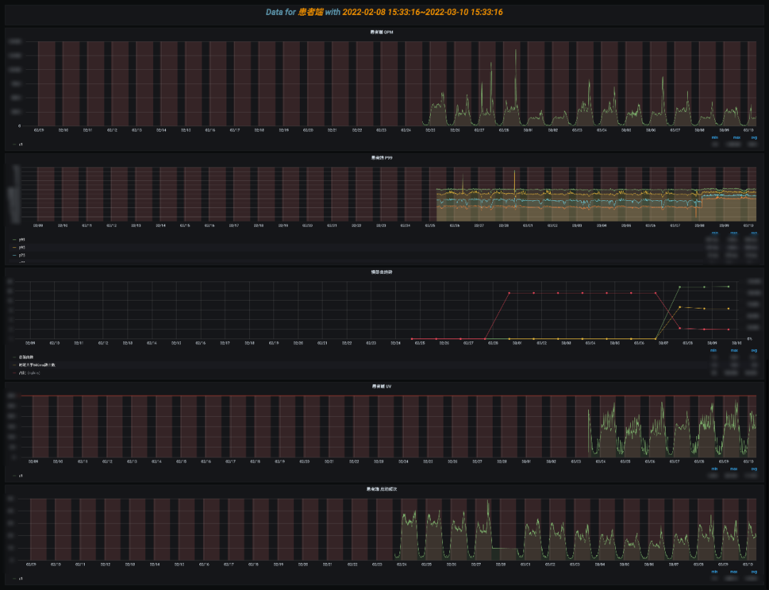 2、长期趋势分析通过首页跳转到长期趋势分析,可以查看最近 1 周/1 月/1 年的宏观趋势,这块可以结合项目上线计划,分析上线节点前后的变化,如 UV 是否有增加,慢路由是否有增多的趋势,还可继续下钻分析具体哪些路由慢了。