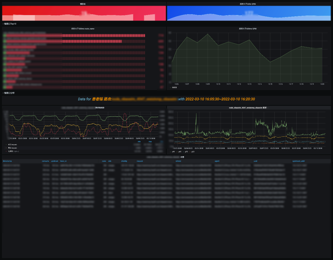 一般重点关注 Top10 的慢路由,可以分析是长期慢,还是突发抓取的慢,结合 APM 链路分析,整个请求慢在哪,是依赖中间件慢还是请求路径过长抑或是存在其他慢风险。这部分依然可下钻到”NO5.路由详情分析“,”NO6.抓取分析“。