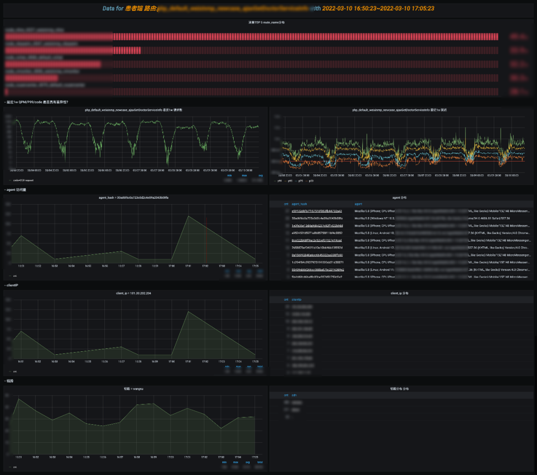 code 分布是否具有显著差异性,如 P99 时延增加了,可能是缓存命中率 code=304 过低了。同比环比是否具有差异性?尤其是周期性存在明显波动,或突发波动的会被优先怀疑。由于是在分析具体的路由,首要怀疑是否有线上变更,如图中 P99 具有显著差异性,是因为当天业务有修改线上配置造成的。结合链路分析慢的问题,最终优化了链路请求解决了这个问题。是否是抓取造成的?另外一个常见的异常是由于蜘蛛突发抓取造成的,为了资源最大利用率,一般不会冗余过多的机器,当蜘蛛突发抓取冷数据的时候可能会造成波动。这部分主要是分析 UA,为了避免 UA 过长带来的分析性能损耗,采用了 hash ua 的方式。结合 ua 占比,ClientIP 占比,评估是否存在抓取的可能,具体可以下钻到”NO6.抓取分析“。是否存在地域差异性?如北京用户异常占比过高,可能是北京链路出现了异常。异常分布运营商节点是否存在显著差异?比如腾讯回源造成缓存穿透。异常分布在后端节点上是否具有显著差异性?从而判断是否存在机器问题。这部分可以继续往机器的维度下钻,分析是 CPU 或其他资源异常。如果以上常见场景都没命中,可以分析客户端相关信息是否具有显著差异性。6、抓取分析抓取分析就比较简单了,判断 UA 和 ClientIP 访问占比,抓取一般特征是单个 UA 访问量突增,ClientIP 比较集中,结合 QPM 长期趋势,判断是正常访问还是抓取。