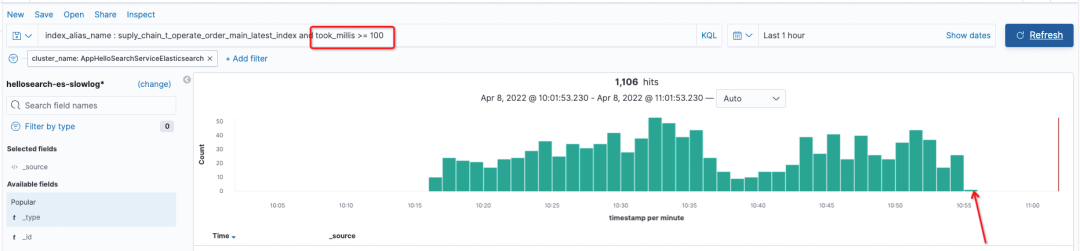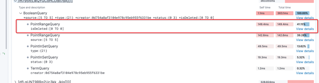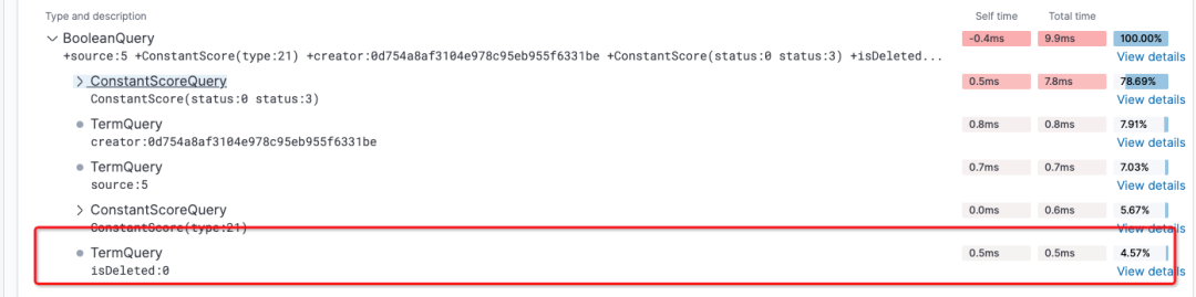 索引切换之后的效果也非常的明显,通过kibana的profile分析可以看到,之前需要接近100ms的PointRangQuery现在走倒排索引,只需要0.5ms的时间。