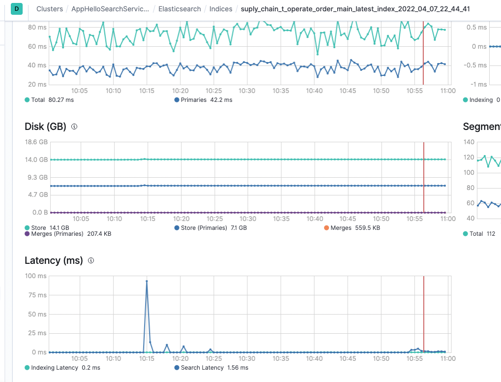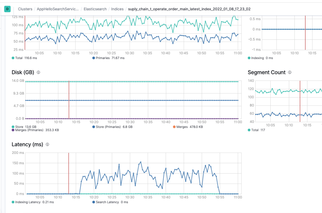 之前这个索引的平均latency在100ms+,这个是es分片处理的耗时,从搜索行为开始,到搜索行为结束的打点,不包含网络传输时间和连接建立时间,单纯的分片内的函数的处理时间的平均值,正常情况在10ms左右。