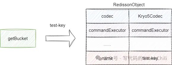 对于RBucket对象的set和get操作本质上都是基于redis字符串操作指令set和get的一层封装,在我们调用getBucket获取对应key的bucket的时候,redisson会基于当前客户端的连接信息和bucket键进行一次封装得到一个test-key的bucket对象: