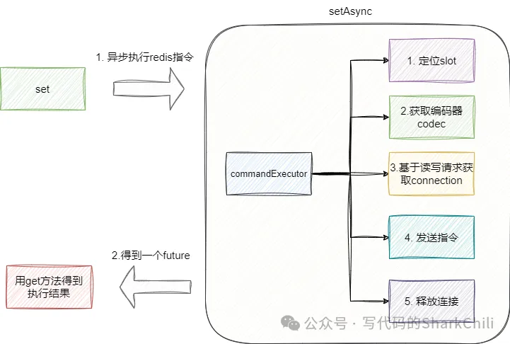 然后就是执行set指令了,我们都知道redisson是基于Netty封装的redis操作工具,所以在进行redis操作时涉及了大量优秀的异步读写涉及,我们以上文set操作为例,实际上其底层执行时做了如下几件事: