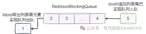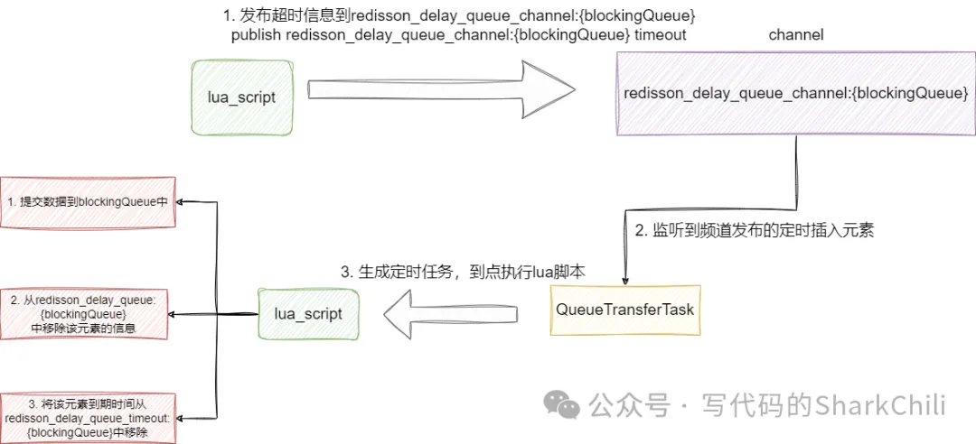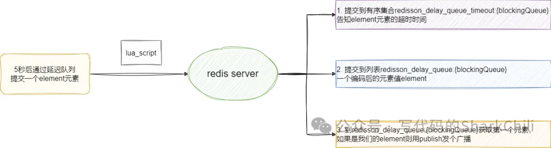 从redisson_delay_queue_timeout:{blockingQueue}这个超时队列中获取到期的元素。将元素值提交到blockingQueue中。将本次延迟提交的元素从redisson_delay_queue_timeout:{blockingQueue}、redisson_delay_queue:{blockingQueue}中移除。