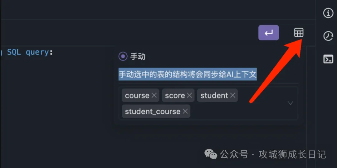 在开始聊天之前,先检查一下数据库里的表结构是不是已经选好了。如果还没有选,就手动选一下,并且把表结构同步给AI,这样它就能了解上下文了。