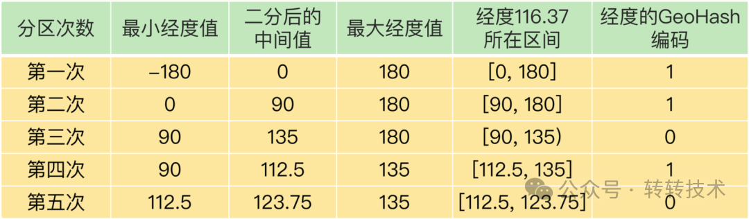 以经度为例,在进行第一次二分区时,将经度范围[-180, 180]进行二分,得到两个区间 [-180, 0) 和 [0, 180]。然后判断当前经度落在哪个区间,若落在左区间,则记录为0;若落在右区间,则记录为1。如此反复,每次都会得到一个二进制值。