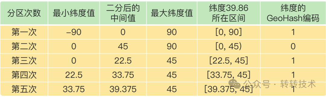 上面提到了GeoHash编码,其实是分别对经度和纬度进行编码,然后再组合成一个新的编码。这个方法叫:二分区间编码