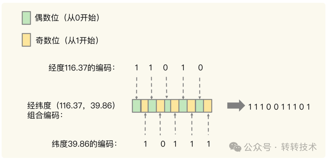 从左到右按顺序,将经度编码值逐个放入偶数位从左到右按顺序,将纬度编码值逐个放入奇数位图片