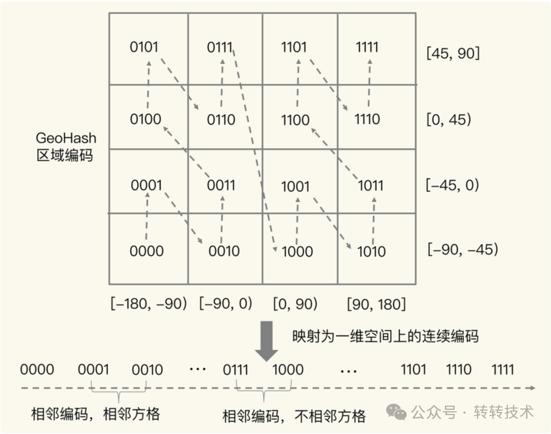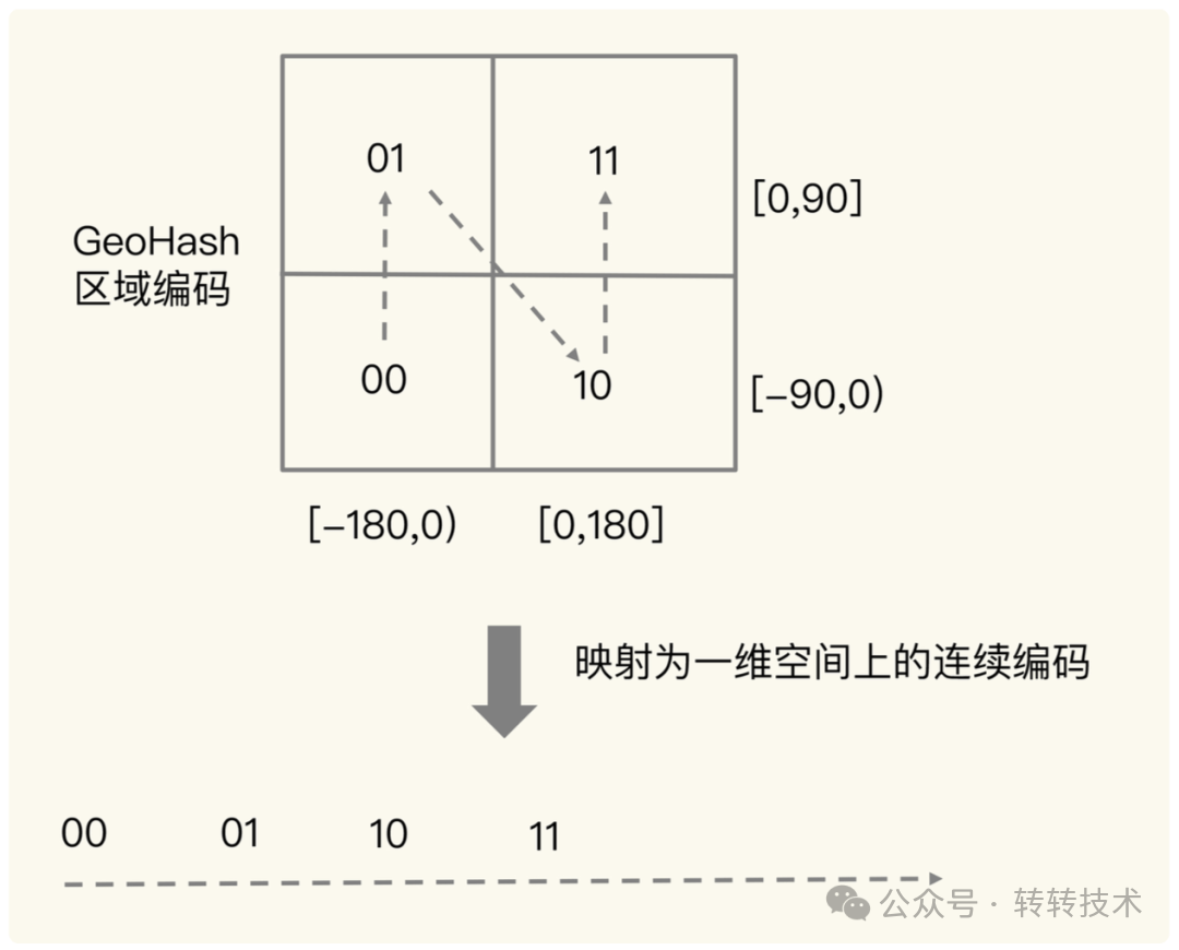 而一次二分区的结果,便是图中的4个方格,同时也对应了4个分区,每个分区都包含指定范围的经纬度。那对于N次二分区来说,N越大,分区也越多,每个分区所包含的经纬度范围就越小(所能覆盖的地理空间越小),对应映射在一维空间上的点越小,点越小则越精准。