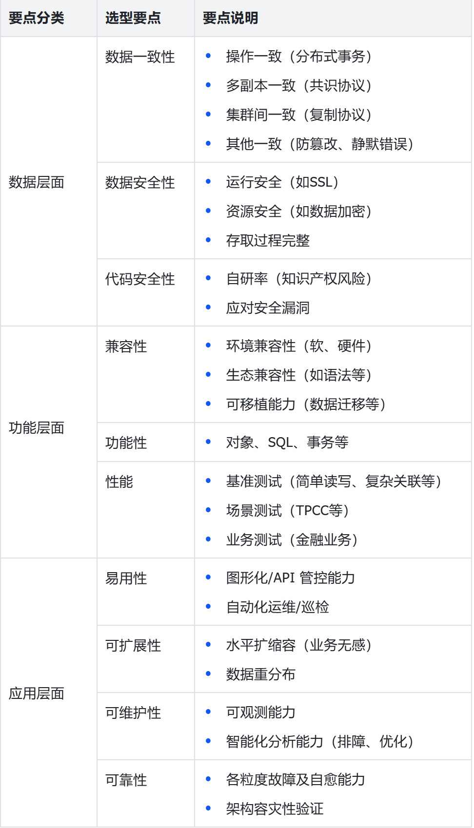 数据库选型涉及到方方面面,因素是比较多的。特别是针对分布式数据库,因其架构较传统架构有着较大差异,因此在选型过程中更应全面考虑。之前个人也整理过脑图及超过数百页的选型文档,可以说是较为繁琐的工作。这也是妨碍很多用户选择使用国产数据库的难点之一,很少有用户有足够的技术储备、宽裕的精力去完成这一工作;而更多的只能听取来自乙方厂商的宣传。这也为后续的替换工作埋下了一些隐患,笔者也听说有国内用户做完数据库替换改造不久之后,又启动新的替换工作,相信这是无奈之举,但也造成了很大的资源浪费及不必要的风险。下面则是书中给出的一些选型要点