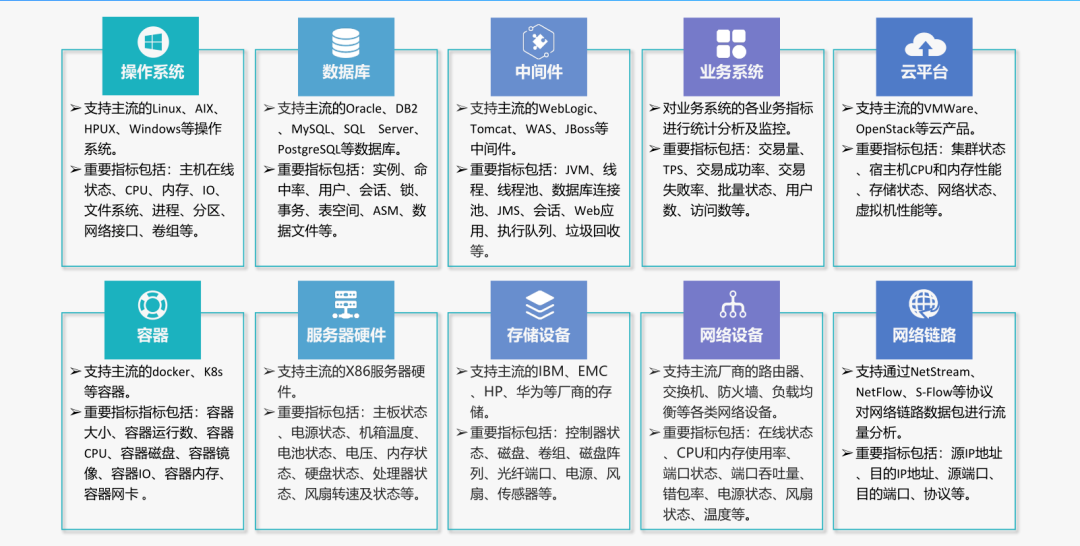 ZABBIX Server部署在总行,集中化统一管理。按地域划分,每家分行部署独立Proxy,Proxy各模块容器化部署,灵活调度、易于迁移和扩展。Proxy与Server之间数据采用压缩模式、加密传输,保障网络无压力和数据安全。2、全面支持开源/信创依赖ZABBIX开源属性,全面支持行内开源软件及信创产品的监控纳管,推进监控自主可控,具体包括: