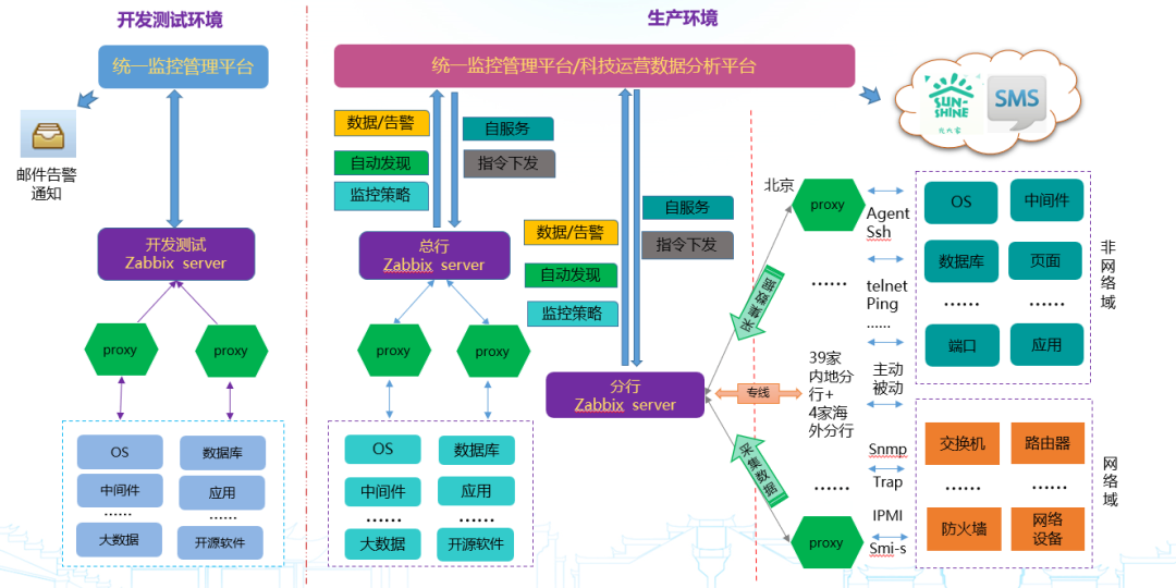 1、监控部署架构根据总、分行以及生产、测试划分使用多套ZABBIX软件,并采用Server-Proxy-Agent的分布式监控架构,有效地降低Server端的采集压力;同时,根据不同环境的特性采用不同的监控方案: