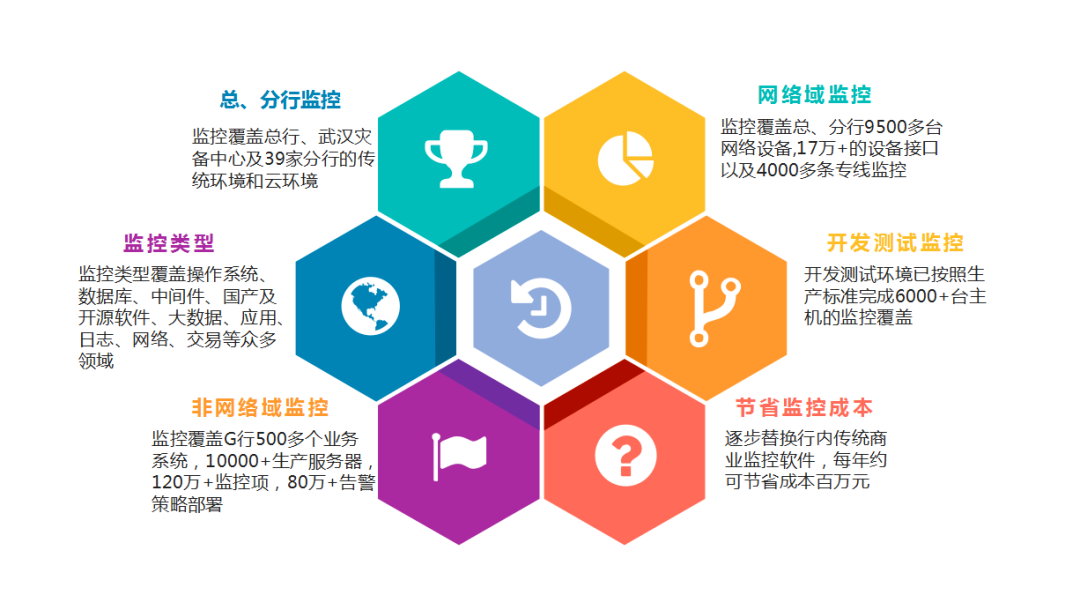 经过四期持续的建设,G行基本完成对商业软件的监控覆盖,在开源软件监控能力、监控自服务能力等各方面都取得长足的进展,丰富并完善监控手段,并在总、分行生产系统监控管理中发挥重要作用。ZABBIX已完成开发测试环境、总行、39家分行监控全覆盖,使用ZABBIX系统对生产环境HPUX系统进行细粒度监控,实现对商业监控软件的能力替代,同时完成39家分行的全面覆盖,正在进行商业监控软件的全面替换。