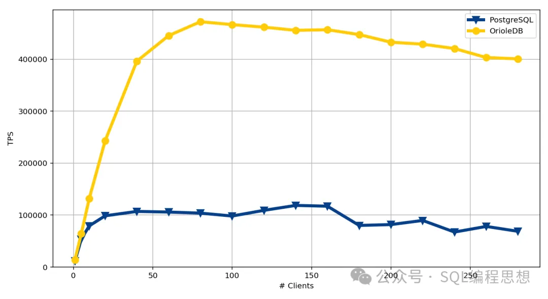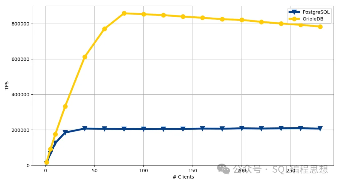 测试一:只读测试显示 OrioleDB 存储引擎的性能是 PostgreSQL 默认引擎的 4 倍。