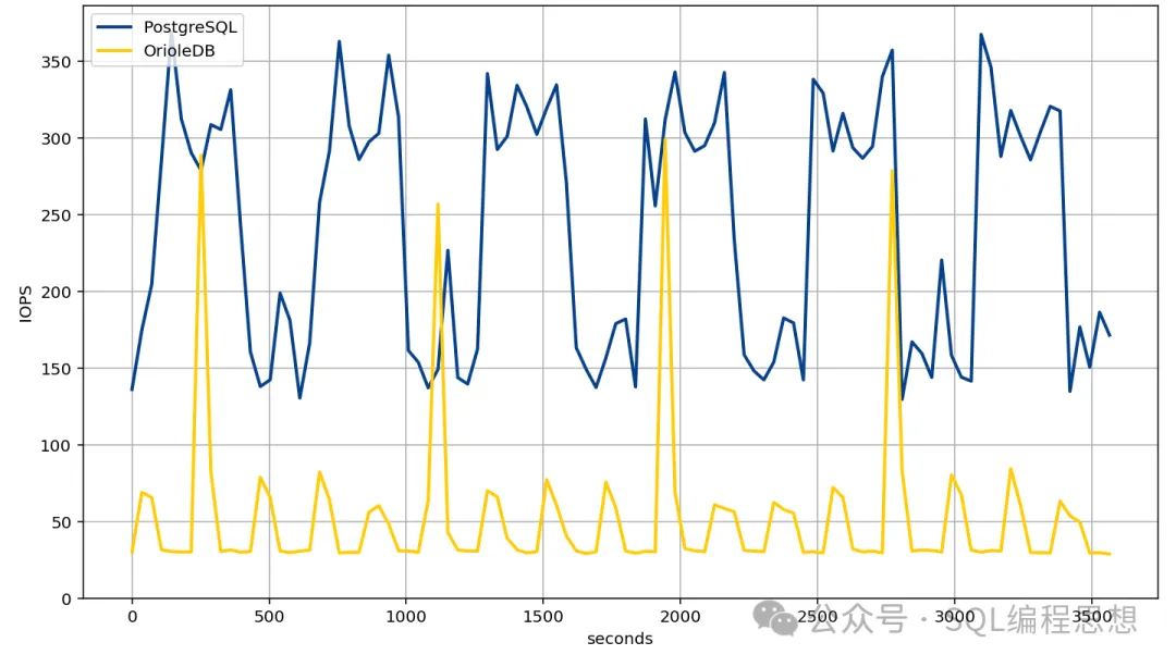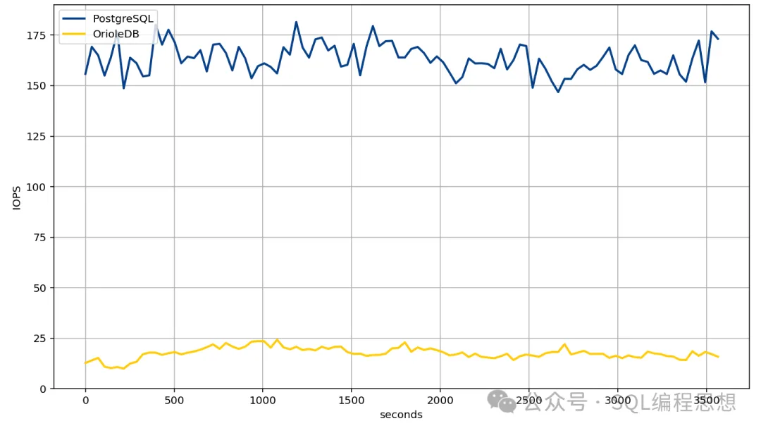 测试三:OrioleDB 存储引擎的磁盘读取(IOPS)是 PostgreSQL 默认引擎的 1/6。