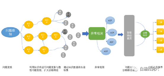 分析引擎通过标准化的框架,根据问题感知输入的参数数据,通过知识推理衍生图谱,裁剪图谱,形成与当前场景相适应的子图,再通过标准框架转换为已知的指标与规则的集合。输入到异常检测模块进行探测,发现可能存在的异常,然后通过标准的智能裁剪框架,根据问题收敛知识图谱对问题进行归类,通过迭代生成诊断结论。再根据诊断结论进行二次发散,找到可以定位问题的工具,通过自动化执行这些工具,进行故障路径二次裁剪,最终获得诊断结果。
