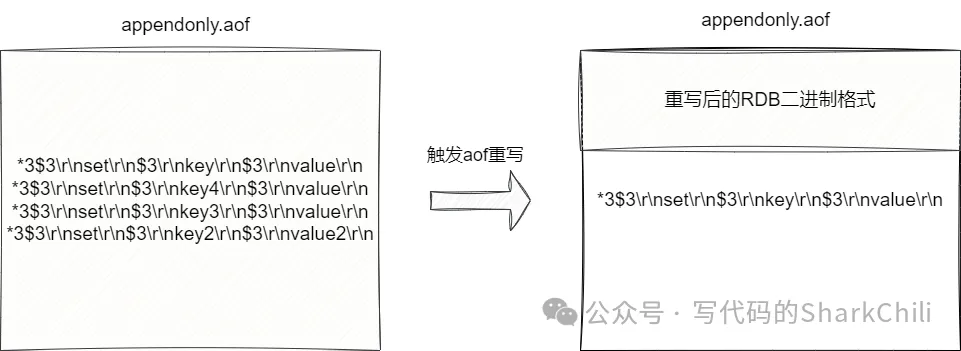 初始状态下,写入的指令都会以AOF格式写入aof文件中。当发生AOF重写时(bgrewriteaof ),redis会fork出一个子进程,进行aof重写。redis将重写的数据以rdb的数据写到新的aof文件中。随后再将aof缓冲区的增量命令(aof_rewrite_buf_blocks)写到新的aof文件中。完成上述操作后我们就会得到一个前半部分是RDB后半部分是AOF的aof日志文件。最后将新的aof文件替换掉旧的rdb和aof文件。对应的重启后的加载流程也改为: