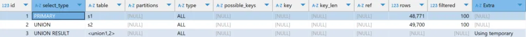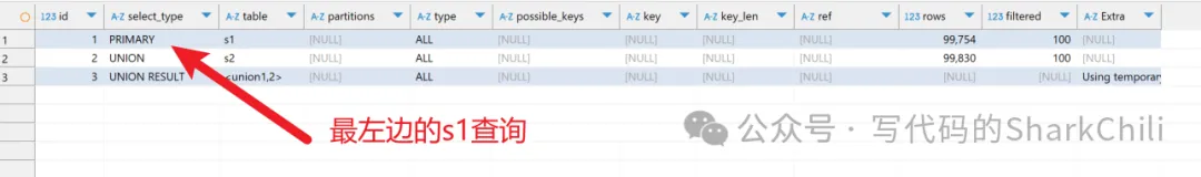 从执行计划可以看到s1的id为1,s2的id为2,分别进行了一个select查询: