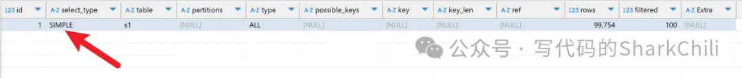 (1) SIMPLE:简单查询,如下所示,可以看到简单的SQL语句就属于这种查询类型