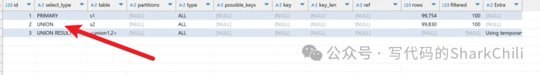 (3) UNION:从执行计划的截图就可以看出union关键字后面的SQL就属于union