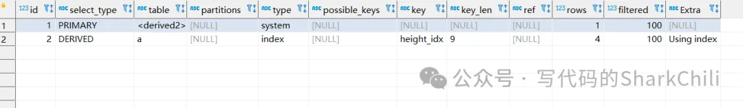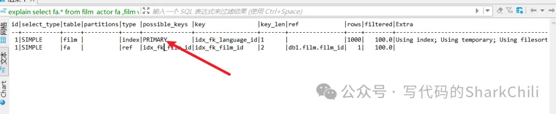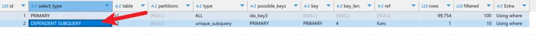 我们查看执行计划的截图,可以看到涉及这种嵌套查询的SQL左边的SQL就是PRIMARY: