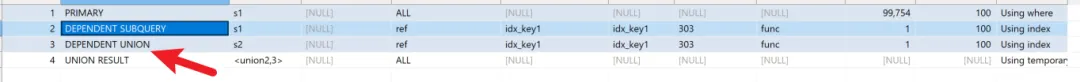 这一点,从执行计划中就可以看出,子查询内部的s2查询的类型就是DEPENDENT UNION